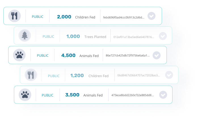 Each Corporate Partner public profile page contains all giving transaction data, complete with a 4 unique blockchain records. The blockchain hash ID listed per transaction allows viewers to directly analyze the records on the EOS Blockchain.